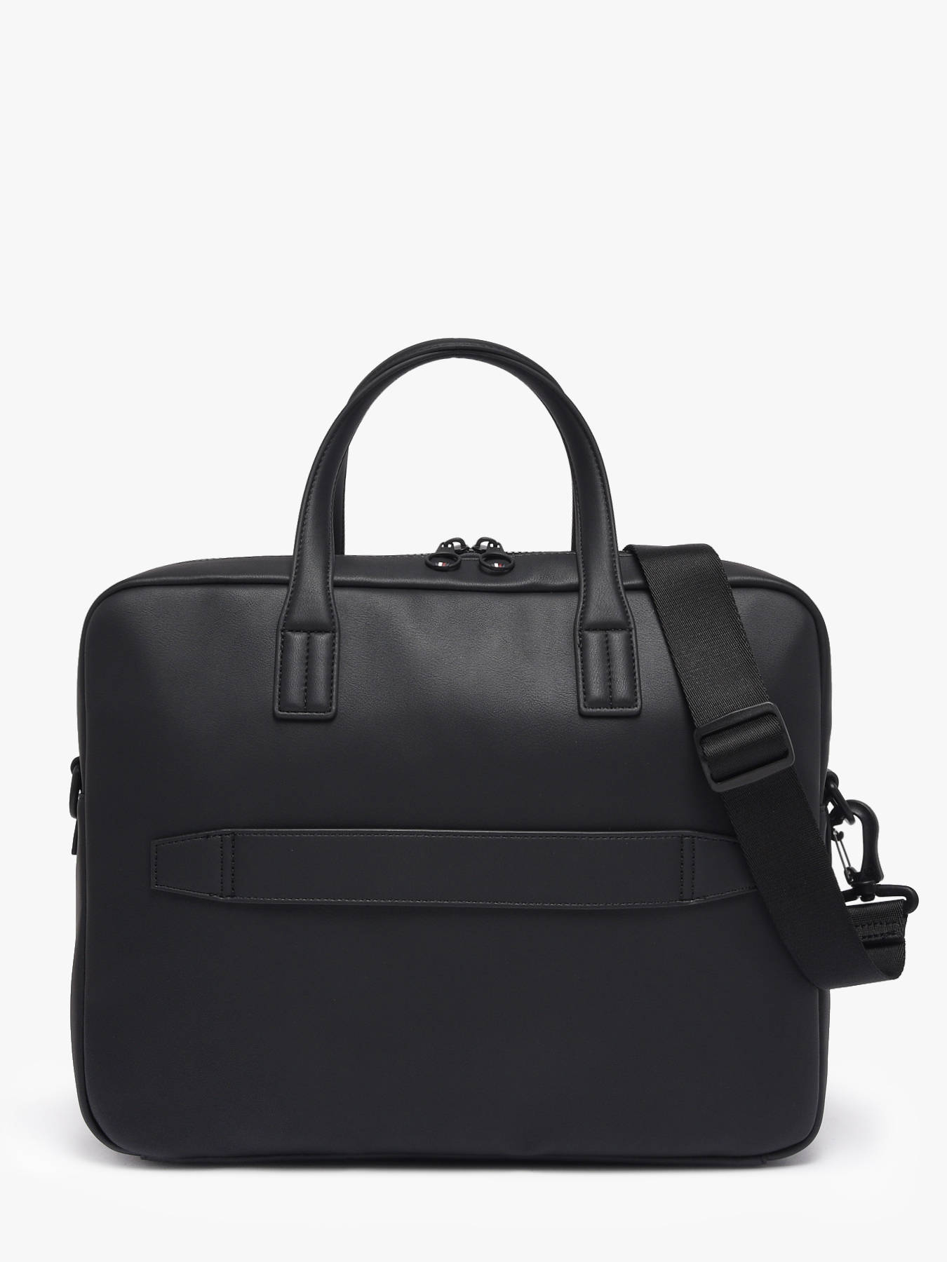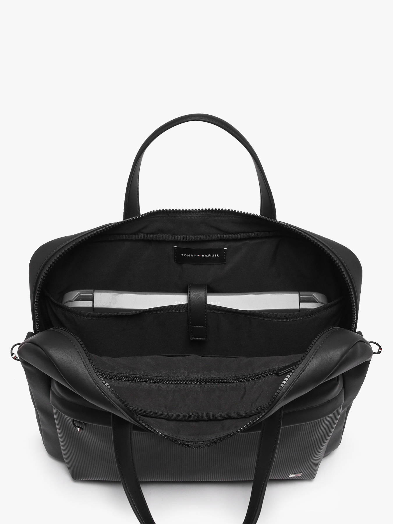 The Tommy Hilfiger document holder made from recycled P.E.T combines elegance and practicality with an eco-friendly exterior. It features a front zip pocket, adjustable and removable shoulder strap, and a support loop for telescopic handle, ensuring optimal comfort for carrying by hand or shoulder. Inside, it includes one main compartment, two simple pockets, one zip pocket, and a dedicated laptop pocket for up to 15.6 inches. This document holder can hold an A4 folder and a notebook, perfect for everyday professional organization.