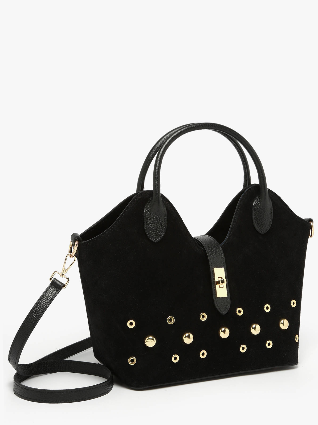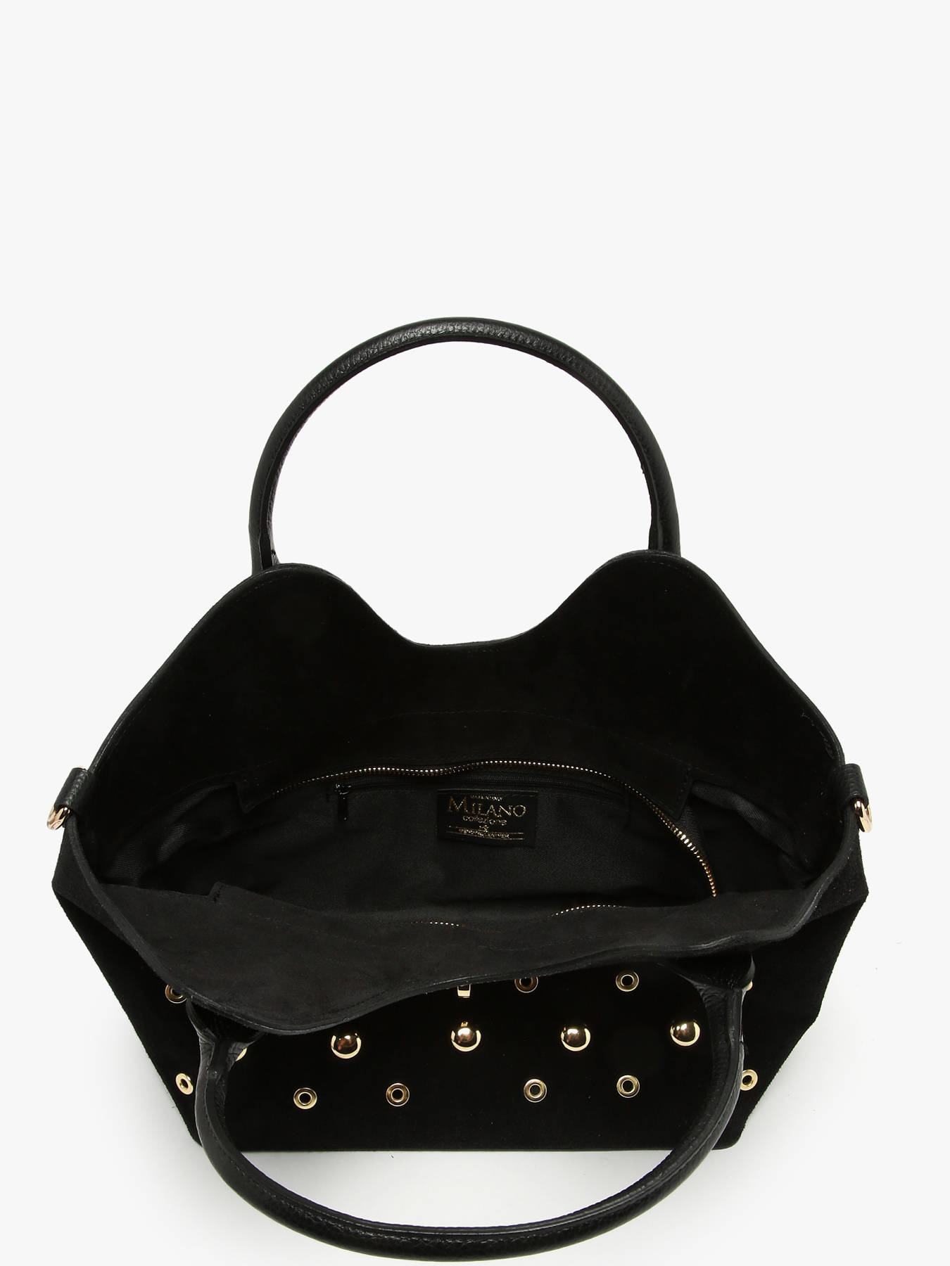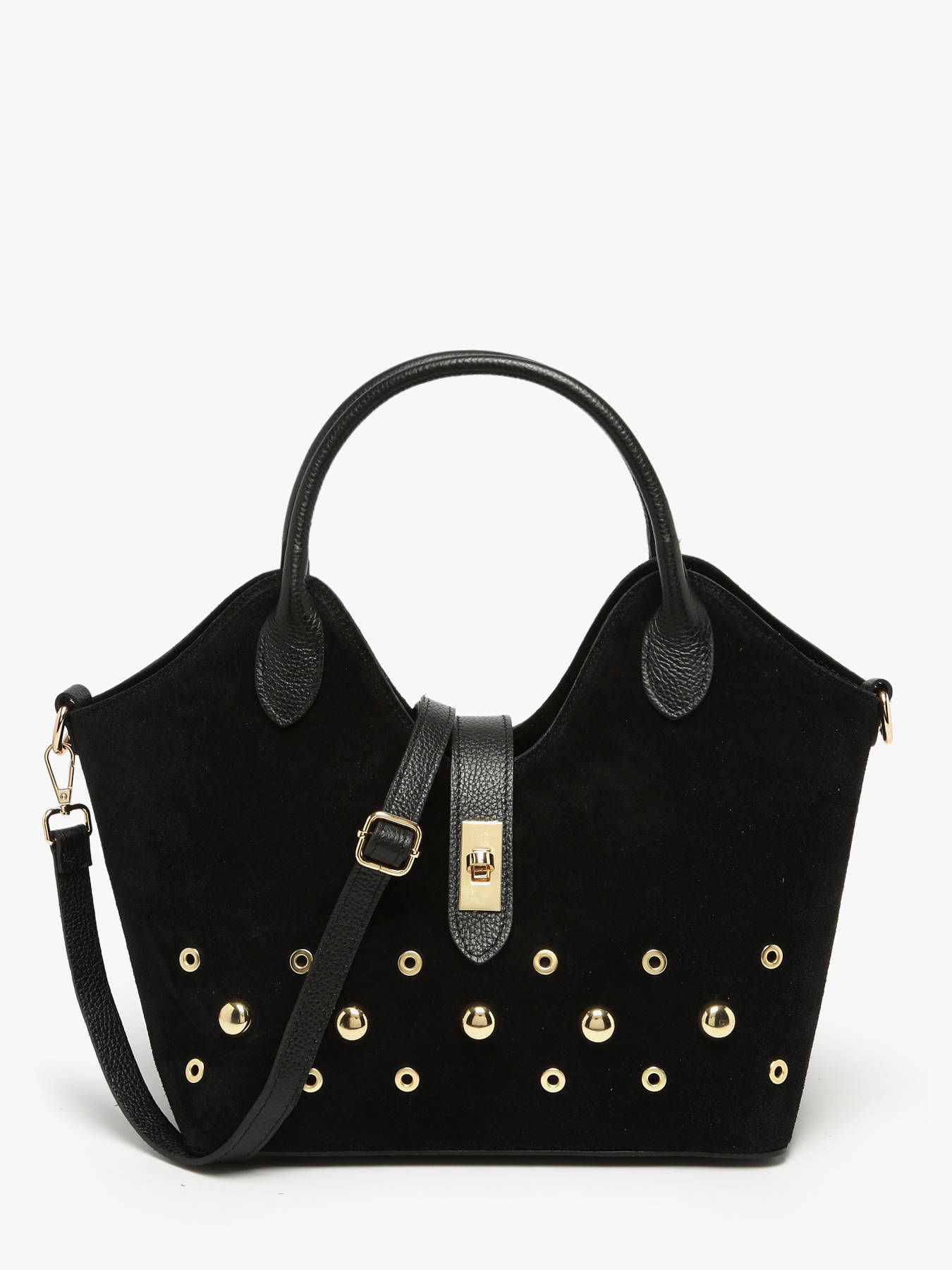 The MILANO VELVET STUDS handbag, available in four colors, combines bold style and elegance with its suede cowhide leather; the exterior features a flap-and-clasp closure, ensuring security and sophistication, while the 17 cm handle drop allows comfortable hand, shoulder, or crossbody wear thanks to its adjustable, removable strap, and the practical interior includes a main compartment and a zip pocket for efficient organization of your essentials; compact yet functional, the MILANO VELVET STUDS handbag stands out for its refined design and versatility, offering a chic, modern accessory that perfectly complements any outfit, from everyday wear to more formal occasions.