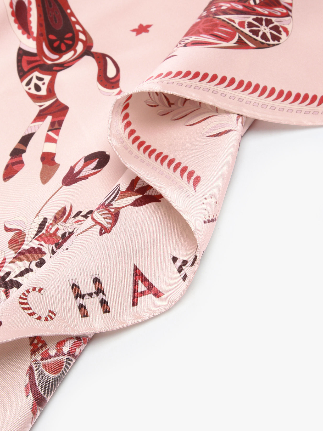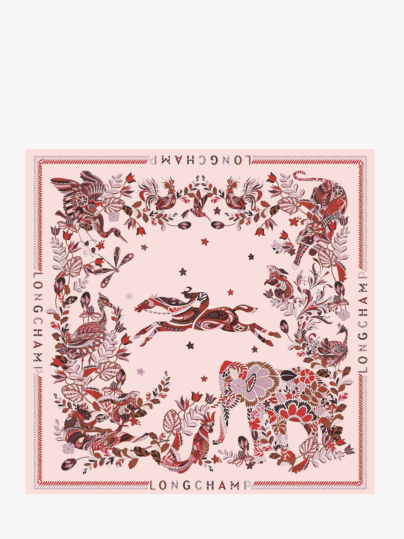 This large 90x90 cm silk scarf, GOTS certified, is an iconic piece from the House of Longchamp. Featuring a vegetal tableau where the signature Longchamp horse intertwines with animal silhouettes, flowers, and plants in soft, timeless hues, it embodies natural elegance and creativity. Ideal to elevate your outfits, this oversized scarf tells intricate stories and serves as an artistic extension of the ready-to-wear collection.