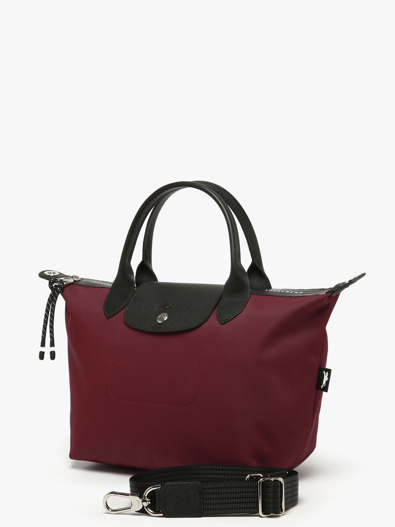 This shoulder bag by Le Pliage Energy by Longchamp has a snap flap decorated with the logo and a zipper closure.