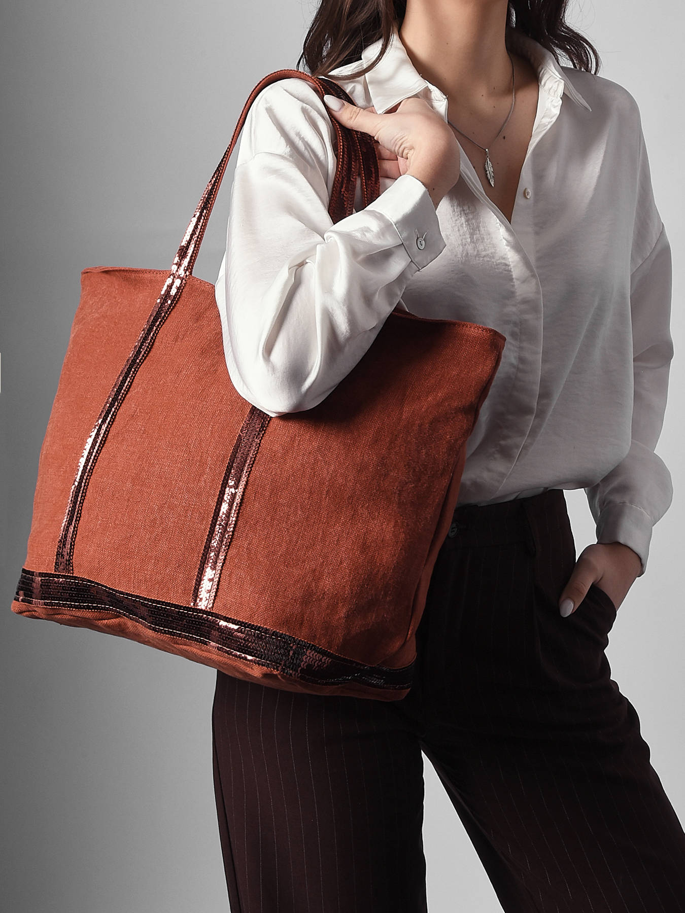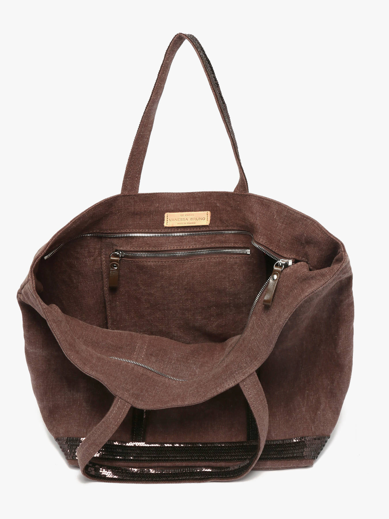 This linnen version of the legendary Le Cabas tote bag by Vanessa Bruno is highly durable and lightweight. The waterproof linnen material is finished with sequin shoulder straps. The bag closes with a zipper and has a central inside pocket. It also features a small inside zipped pocket, which is topped off with a leather label ""Le Cabas Vanessa Bruno made in France"".